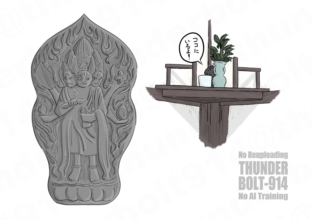 祖父母の家を整理していた父が「台所にある神棚に代々祀っていたコウジンさんが、神様じゃなくて仏様だと分かった」と知らせてくれた。写真を見た氏神神社の神主は「仏様だね」、菩提寺の住職は「馬頭観音かな」と言っていたらしい。俺は、三宝荒神ではないかとにらんでいる。